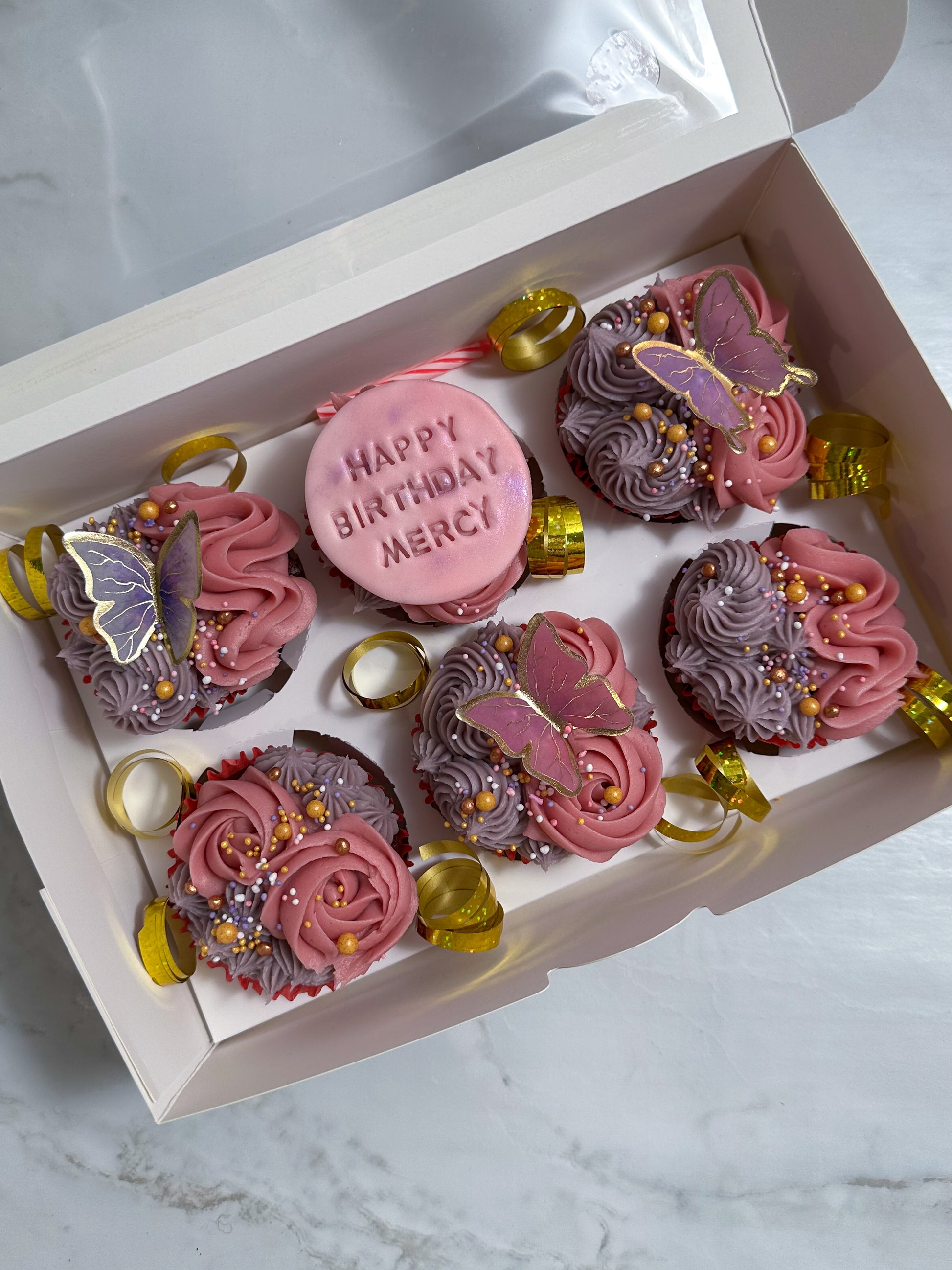 Indulge in a sweet and colorful treat with our Cupcake Box in Purple Paradise! Each cupcake features artisanally piped frosting in lovely shades of purple and pink, topped off with adorable butterfly decorations. Let this be the perfect birthday gift for your loved ones.